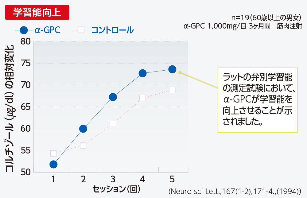 1994年には科学雑誌「NeuroScience Letters」でGPCがラットの学習機能を向上させたと発表しています。これに伴い、子どもの学習能力や集中力、記憶力の向上が期待できます。もちろん固有名詞が出てこなくなる40代以上にも、うってつけです。これを飲んだら「ど忘れが減った」という方々がたくさんいます。