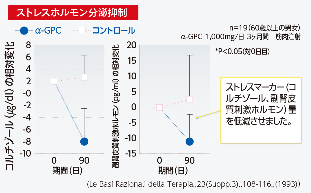 1993年には、科学雑誌「Le Basi razionali della terapia」で、GPCがストレスホルモンの代表であるコルチゾールなどを低減させたことが掲載。