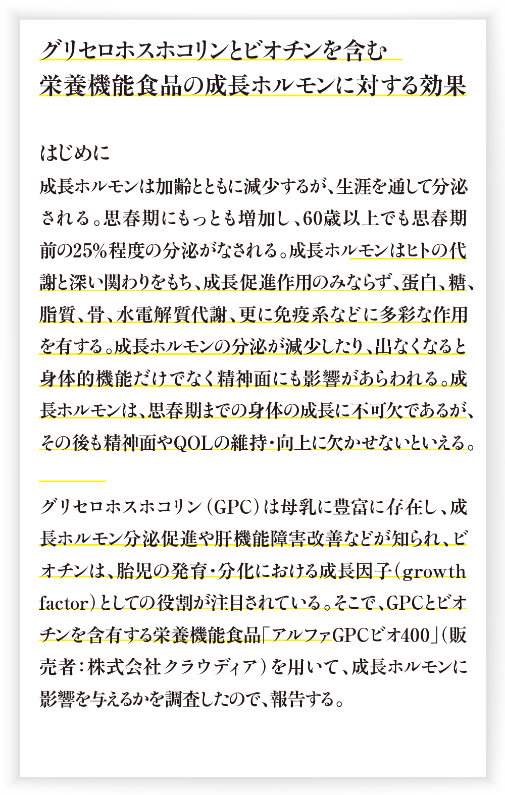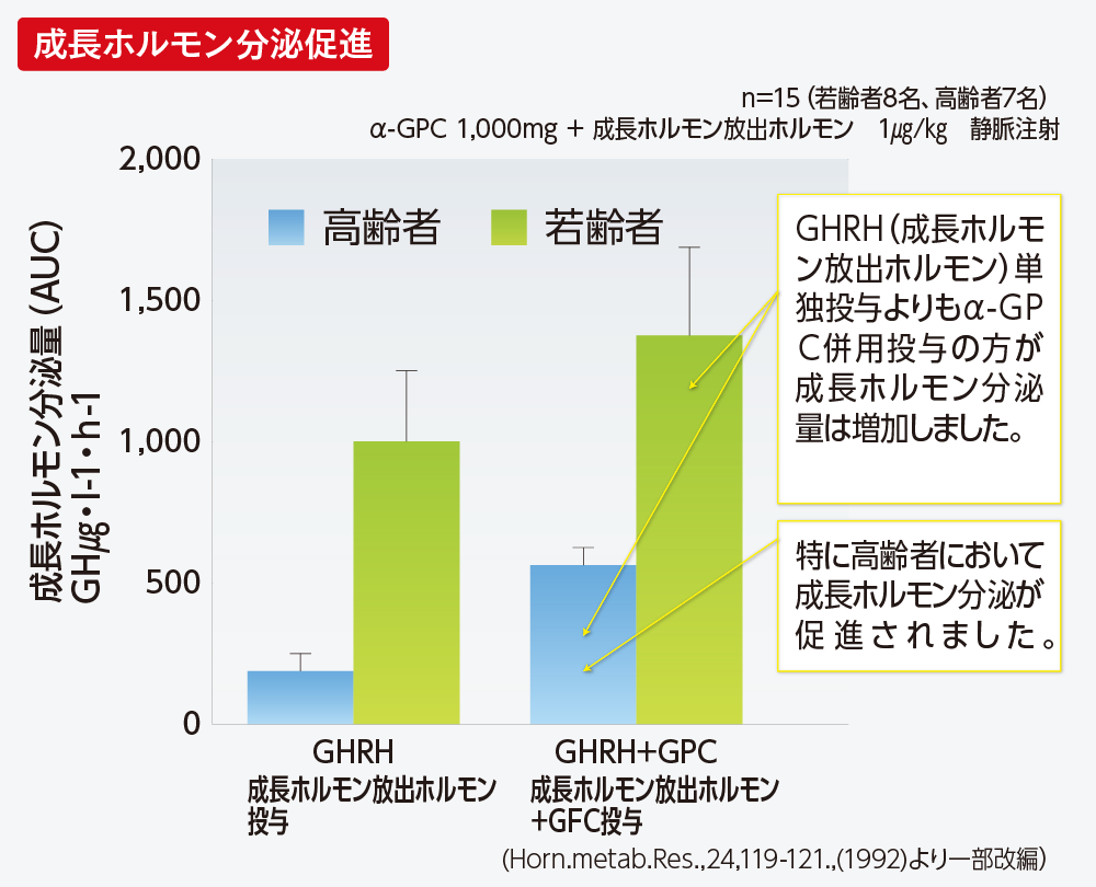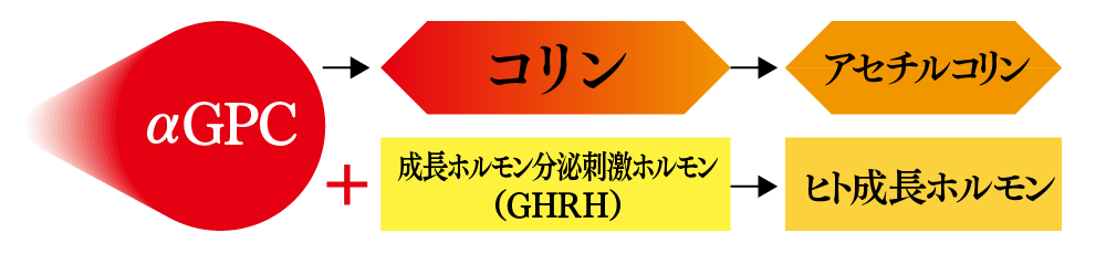 またGPCはアセチルコリンの前駆体としての機能とは別に、成長ホルモン分泌刺激ホルモン(GHRH)と接合して、下垂体前葉より分泌される内因性ヒト成長ホルモンを増加させます。