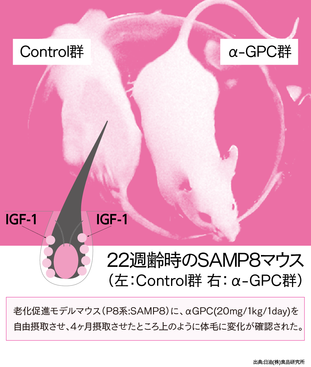 GPCが成長ホルモンの分泌を促進し、血中の成長ホルモンが一過的に分泌促進されることにより、毛母細胞を養う毛乳頭細胞に成長ホルモンが運ばれ、IGF-1(インスリン様成長因子-1)の分泌が促進されることがわかっています。