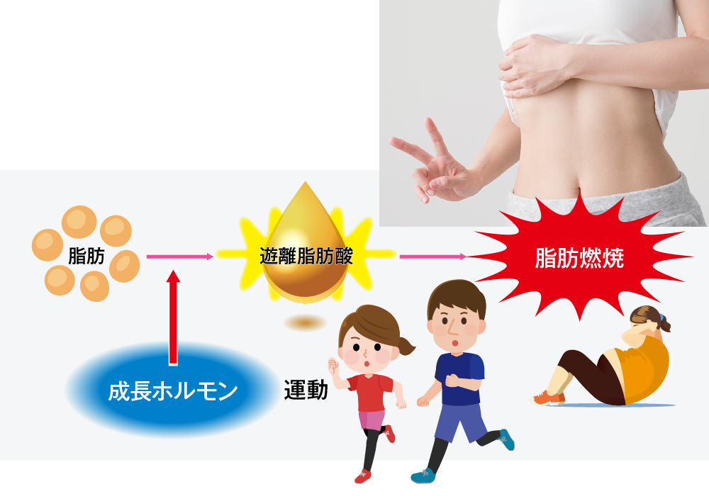 成長ホルモンの代表的な働きの一つに、脂肪燃焼促進作用があります。人間は、消費しきれない余分なエネルギーを、脂肪細胞に中性脂肪として蓄えています。成長ホルモンには、脂肪細胞に蓄えられた中性脂肪を「遊離脂肪酸」へと分解する働きがあります。運動を行うと、遊離脂肪酸は全身の筋肉で分解され、エネルギー源として利用されます。つまり成長ホルモンは、脂肪燃焼を促進する働きも持っているのです。
