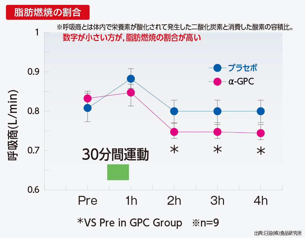 1)健康な成人に、GPC1,000mgの摂取30分後から30分間、有酸素運動を行って検証したところ、GPC摂取群はプラセボ群に比べてより高い脂質燃焼促進効果が認められました。つまりGPCはダイエットにも効果的なのです。