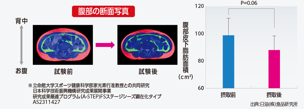2)中高齢女性に、1日あたりGPC1,000mgを摂取、および週3日の有酸素運動を4週間実施し、腹部の皮下脂肪面積を測定したところ、試験前と比べて、減少傾向が見られました。