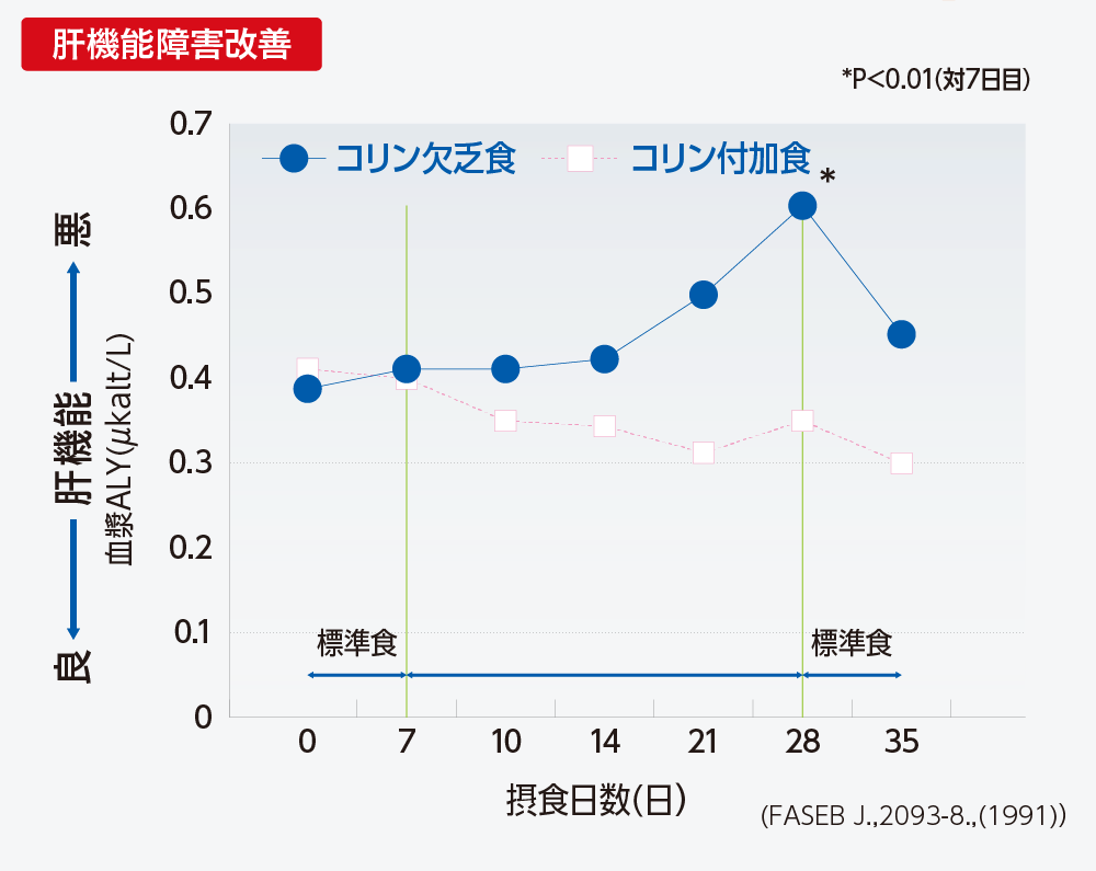 コリンが欠乏すると肝機能障害の代表的マーカーの一つのALT(GPT)濃度が上昇します。
