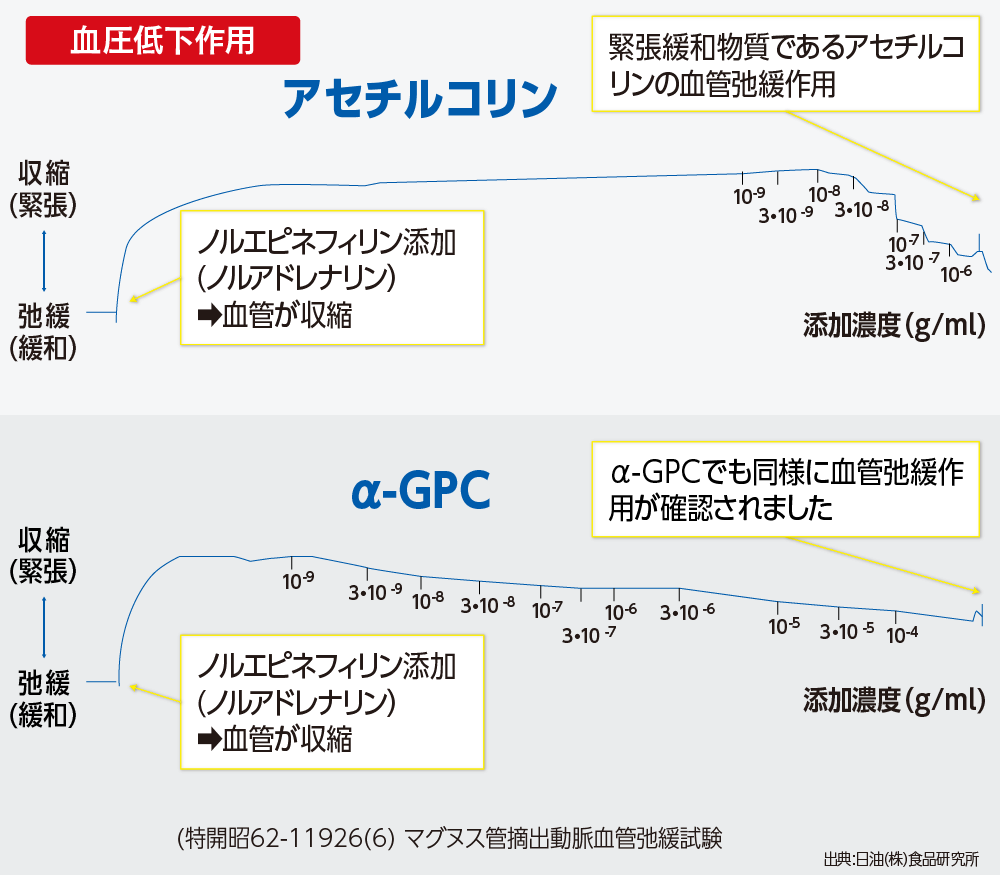 GPCはアセチルコリンと同様に血管弛緩作用を示すことから、血管を拡張し血圧を正常にします。