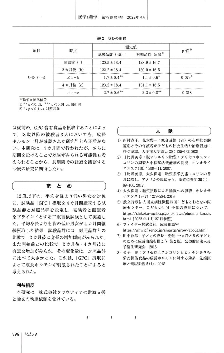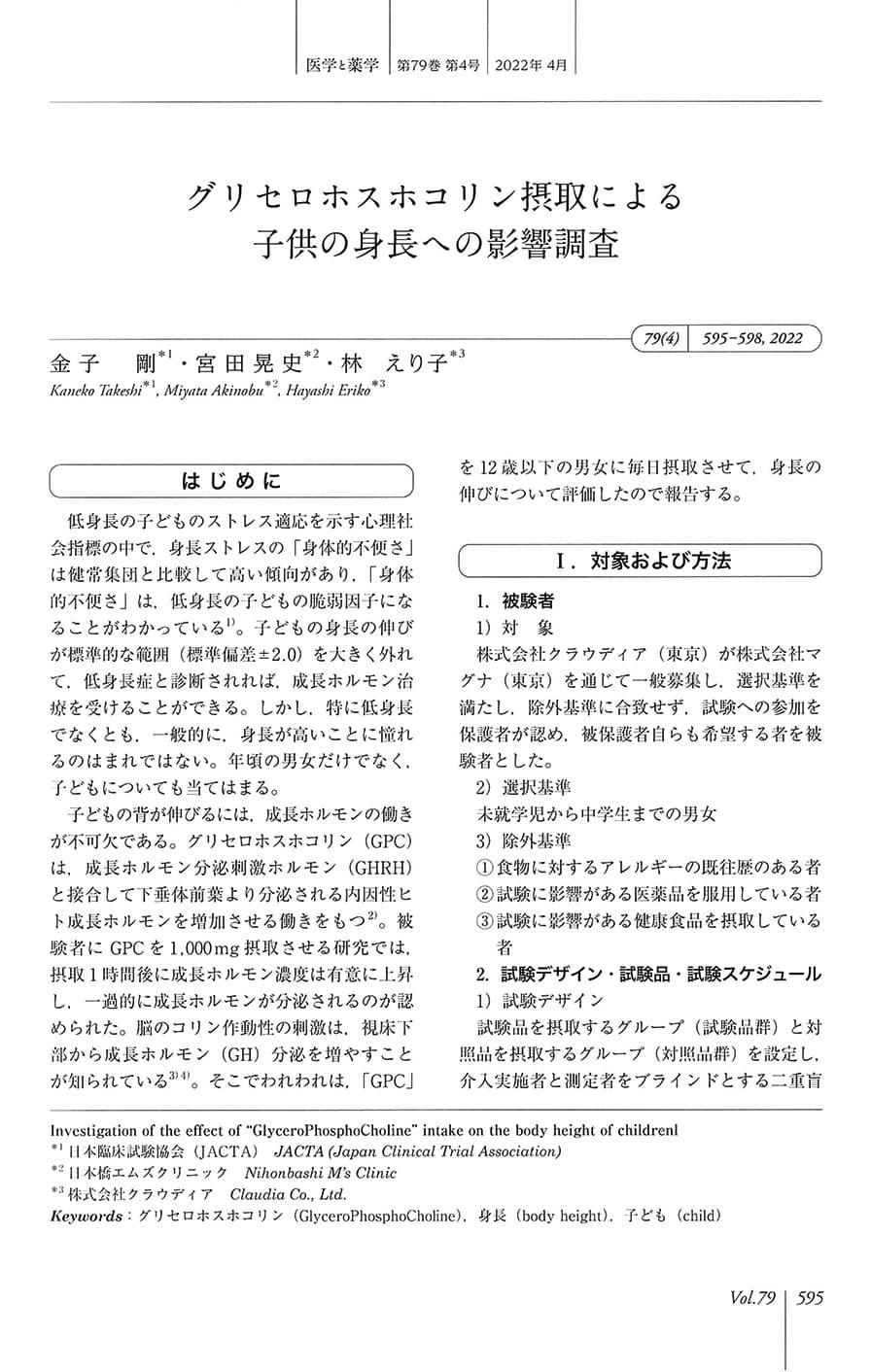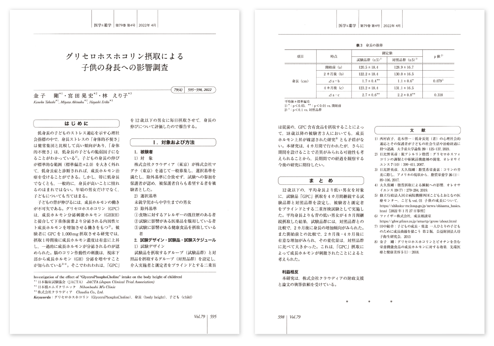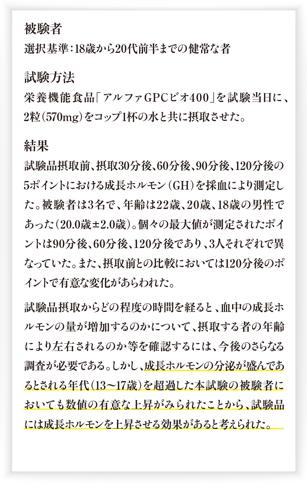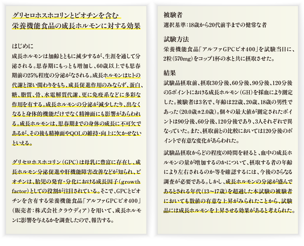 国内外の医学誌や科学雑誌に、さまざまな臨床試験の結果が発表されています。例えば、1992年に科学雑誌「Hormone and Metabolic Research」に、GPCが若者や高齢者の成長ホルモン分泌量を増加させたという論文が発表されています。成長期の子どもの伸長には成長ホルモンが不可欠です。GPCを取ることにより成長ホルモンが増加すれば、背が伸びる可能性がぐっと高くなります。