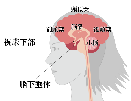 視床下部から脳下垂体を通じて出る代表的なホルモンは成長ホルモン(GH)ですが、ほかにはプロラクチン(PRL)、甲状腺刺激ホルモン(TSH)、副腎皮質刺激ホルモン(ACTH)、性腺刺激ホルモン(LH & FSH)、尿の量を調節する抗利尿ホルモン(ADH)もあります。